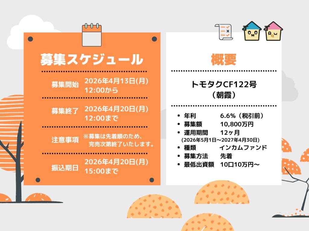 2026年4月20日15:00お申込みには投資家登録が必要になります。予め、会員登録・投資家登録をお済ませのうえ、お申し込み後にファンド専用口座に出資金をお振り込みください。