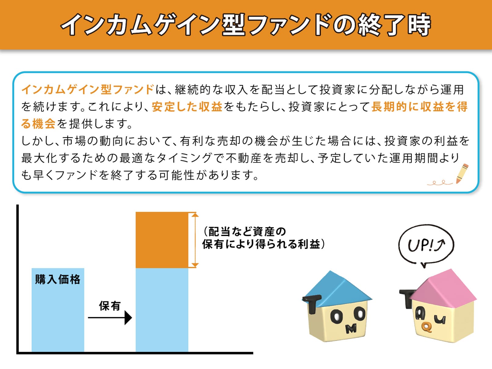 不動産市況や経済情勢などを総合的に勘案し、事業者の判断により、運用終了日前であっても対象不動産の売却を行い、運用を終了する場合があります。