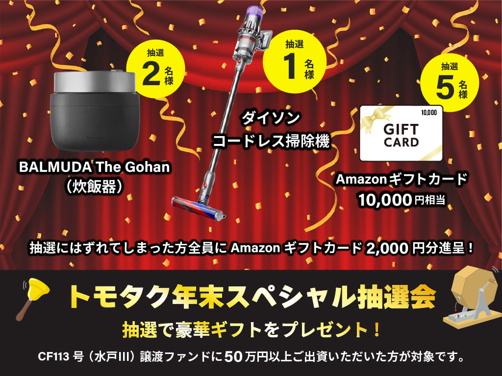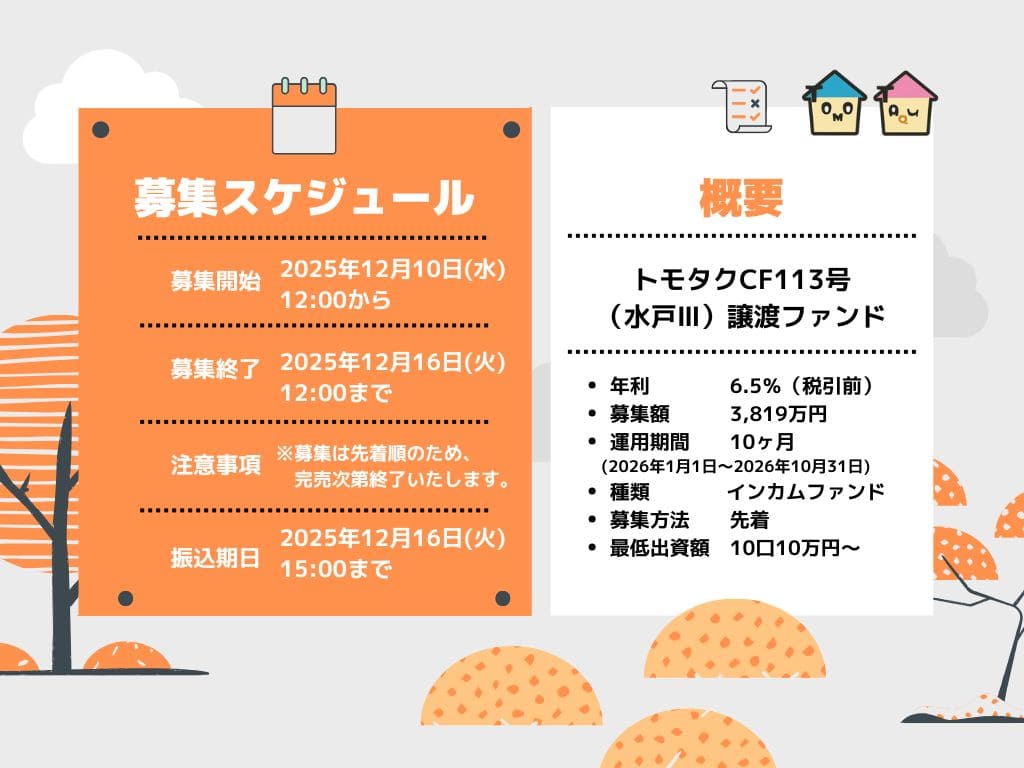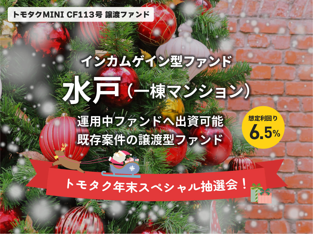 本ファンドは、「トモタクCF113号(水戸Ⅲ)」に係る当社保有劣後出資持分の譲渡を目的とした譲渡型ファンドです。