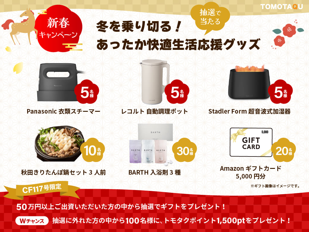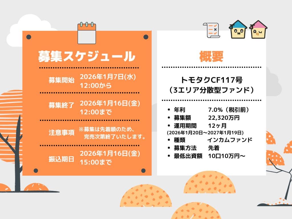 2026年1月16日15:00お申込みには投資家登録が必要になります。予め、会員登録・投資家登録をお済ませのうえ、お申し込み後にファンド専用口座に出資金をお振り込みください。