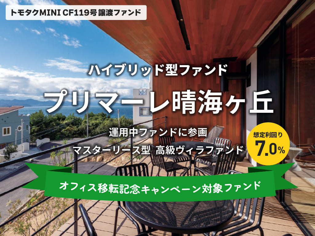 本ファンドは、「【トモタクMINI】トモタクCF119号(プリマーレ晴海ヶ丘)」に係る当社保有劣後出資持分の譲渡を目的とした譲渡型ファンドです。