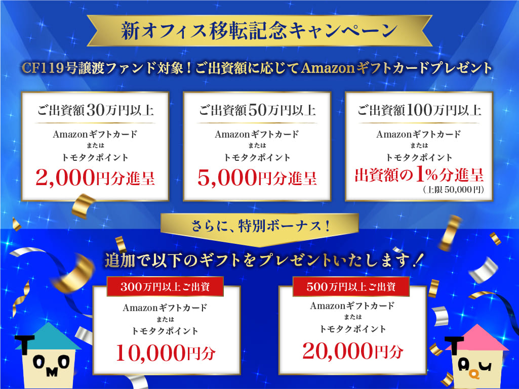 | 100万円以上 | Amazonギフトカードまたはトモタクポイント 出資額の1%分(上限50,000円) |