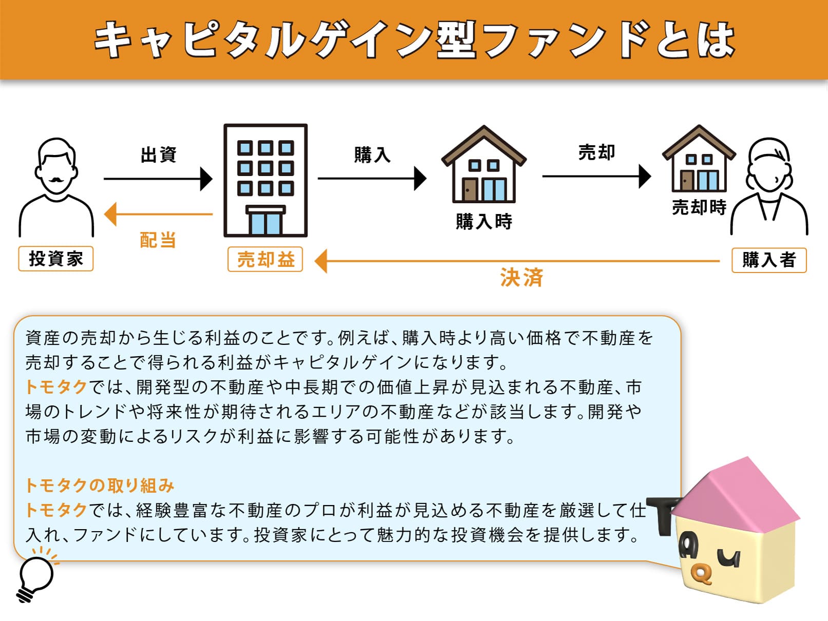 契約終了時において、投資家様は出資の価額を上限に出資金の返還を受ける権利がございますが、トモタク商品は、投資家様の出資金について元本保証をするものではありません。