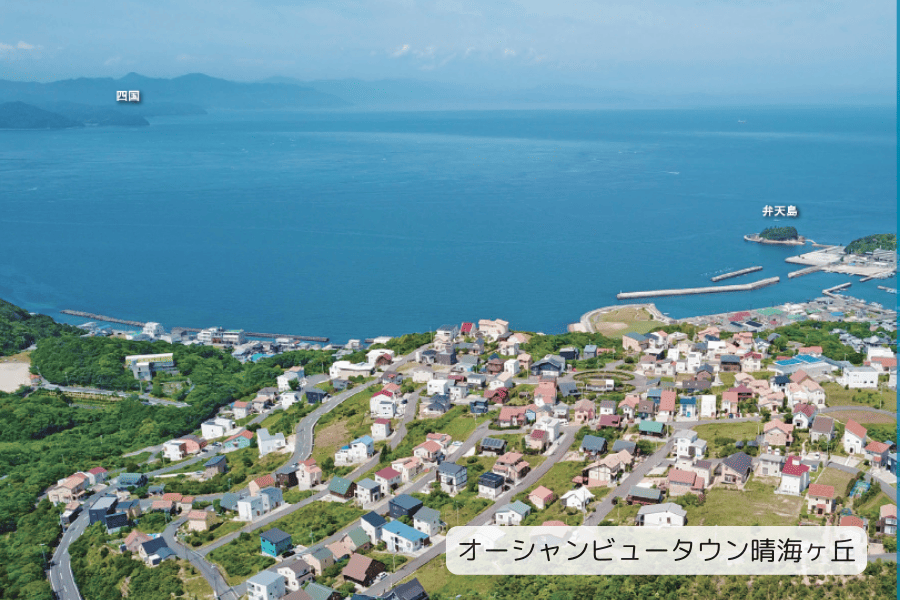 高台エリアからは、時間帯や季節によって表情を変える海の景観や、晴天時には四国の山並みまで見渡すことができ、非日常性と落ち着きを併せ持つ住環境が形成されています。