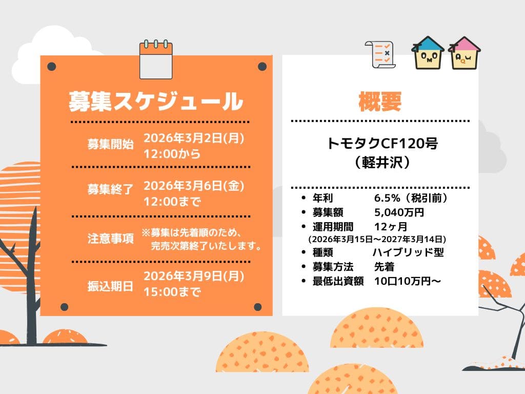 2026年3月9日15:00お申込みには投資家登録が必要になります。予め、会員登録・投資家登録をお済ませのうえ、お申し込み後にファンド専用口座に出資金をお振り込みください。