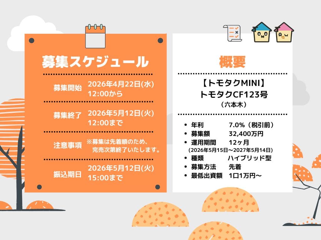 2026年5月12日15:00お申込みには投資家登録が必要になります。予め、会員登録・投資家登録をお済ませのうえ、お申し込み後にファンド専用口座に出資金をお振り込みください。