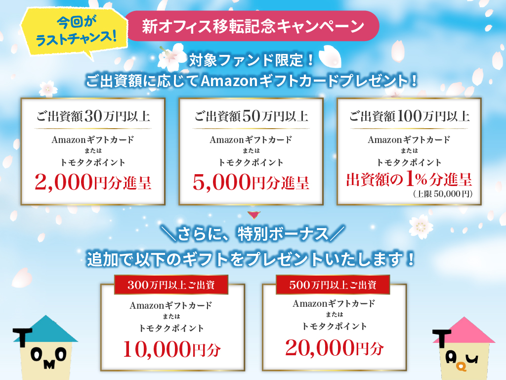 契約終了時において、投資家様は出資の価額を上限に出資金の返還を受ける権利がございますが、トモタク商品は、投資家様の出資金について元本保証をするものではありません。