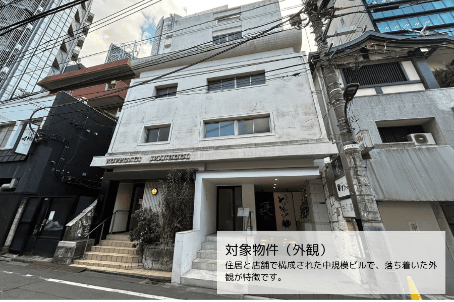 対象物件は、東京メトロ日比谷線「六本木」駅から徒歩約2分、六本木ヒルズ至近という優れた立地に位置しており、商業エリアとしての高い集客力とテナント需要を背景に、安定した収益性が期待されます。現在、居酒屋および会員制鮨店が入居しております。