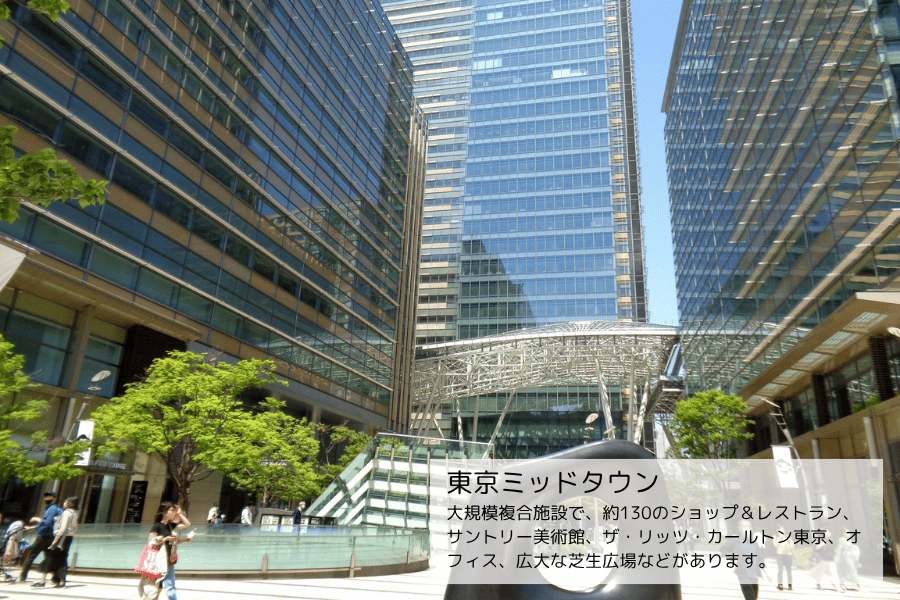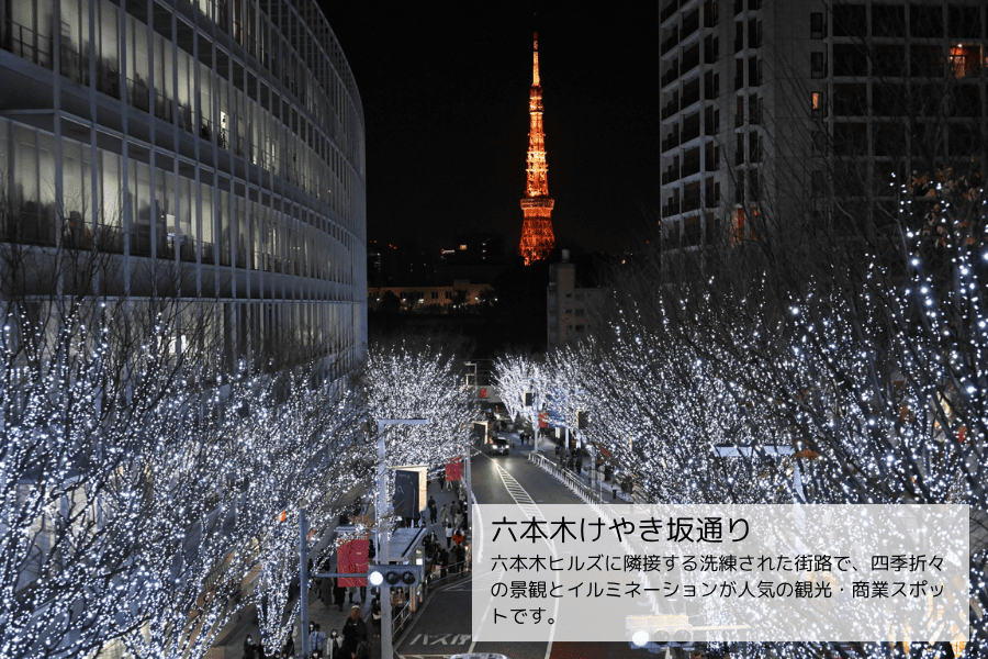 六本木ヒルズや東京ミッドタウンを中心に、大規模複合施設・オフィス・高級レジデンス・ホテルが集積しており、昼夜を問わず多くの人が集まるエリアです。