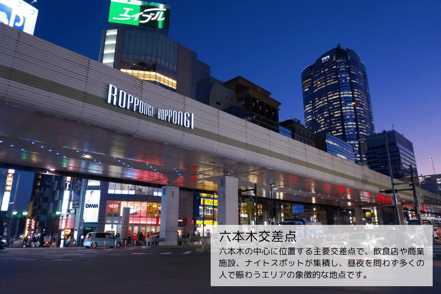 六本木エリアは、東京都港区に位置し、商業・ビジネス・観光機能が高度に集積する都内有数の都市拠点です。東京メトロ日比谷線および都営大江戸線「六本木」駅を中心に、都内主要エリアへのアクセス性にも優れており、国内外から多くの人が集まるエリアです。